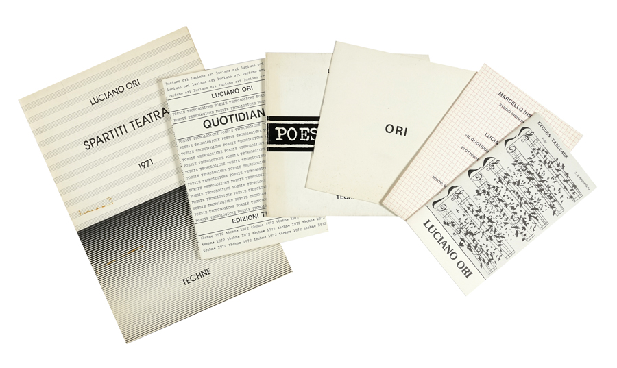 Ori Luciano, 6 opere di e su Luciano Ori e la Poesia Visiva. XX secolo. Compongono il lotto: 1) Ori Luciano, Spartiti teatrali 1971. Firenze: Te'chne, 1973; 2) Id., Quotidiana. Poesie tecnologiche 1964-1968. Firenze: Edizioni Tèchne, 1972; 3) Id., Poesia Visiva. Firenze: Edizioni Tèchne, 1972; 4) Bellini Rolando, Luciano Ori. Musica e altra musica. Firenze: Il Bisonte, 1992; 5) Ori. Catalogo della mostra alla galleria Il Canale di Venezia del 1-14 giugno 1974; 6) Invito alla mostra Marcello Innocenti. Studio Inquadrature 33. Luciano Ori. Il Quotidiano cancellato. 23 ottobre-18 novembre 1982. (6)I OPERA: Prima edizione di quest'opera in cui l'autore ha lavorato su un materiale costituito da articoli di giornale, trattandolo con sottolineature, cancellature e notazioni musicali.