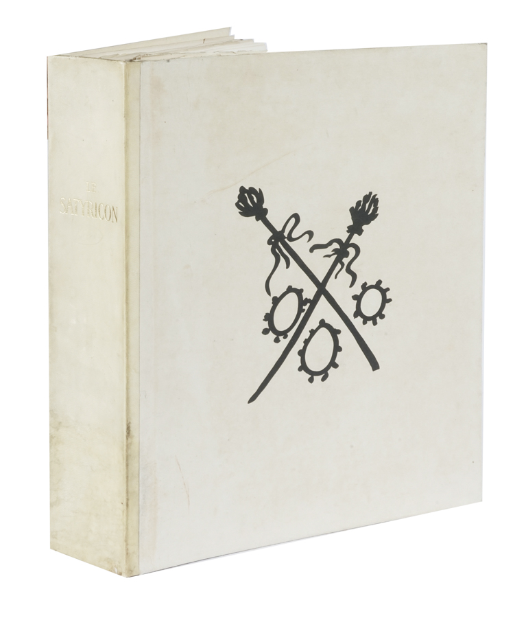 Petronius Arbiter, Le Satyricon. Cuivres gravés par André Derain. Paris: M. Fequet et P. Baudier, 1951. In-folio (mm 440x335). Pagine [8], 290, [3], 3 bianche con 33 incisioni a bulino a piena pagina nel testo e due suite, la Suite sur Auvergne des 36 cuivres gravés par André Derain (36 incisioni, di cui 3 non inserite nella pubblicazione definitiva) e la Suite sul Malacca des 43 bois dessinés par André Derain (43 incisioni su 22 fogli). Copia in ottimo stato conservativo, a fogli sciolti e in barbe. Esemplare n. 74 su una tiratura complessiva di 245 esemplari, uno dei 50 con una suite di bulini su velin e una in nero di fregi su Malacca. Camicia editoriale in carta, custodia in mezza pergamena con piatti rivestiti in carta. Impressioni in nero ai piatti, titolo in oro al dorso. (1)Splendida edizione illustrata da Derain; «Les 33 burins de "Satyricon" furent gravés en 1934 sur un projet d'Ambroise Vollard. Cet ouvrage fut réalisé en 1951 aux dépens d'un amateur et sous la direction d'André Derain». Cfr. Monod 9049.