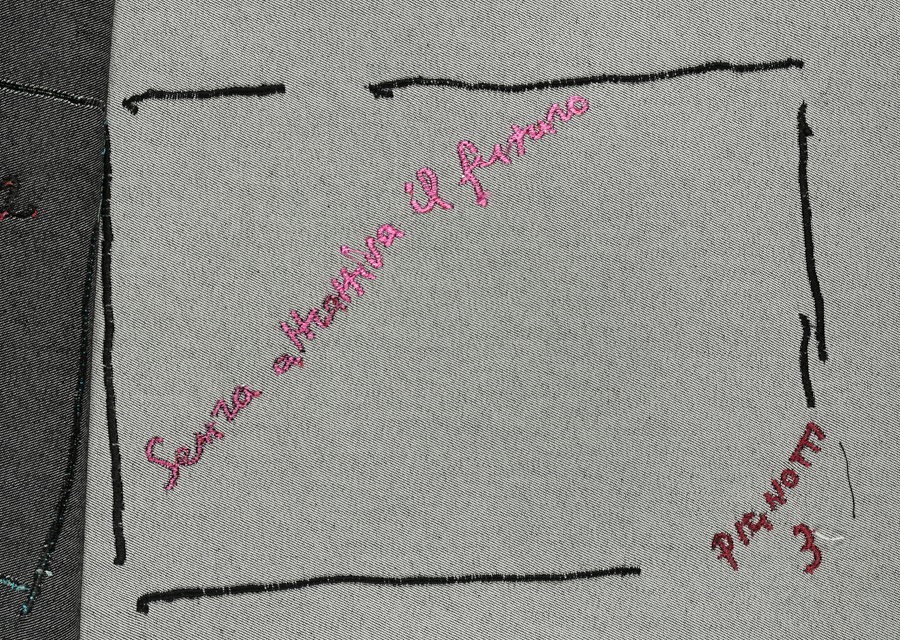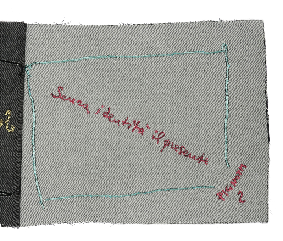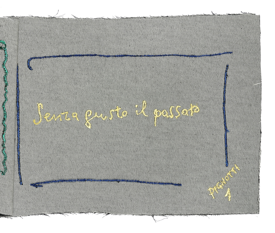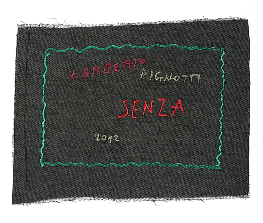 Pignotti Lamberto, Senza. (Libro stoffa) 2012 In-4° piccolo oblungo (mm 220x295). Carte 3 in denim scuro, cucite e ricamate con poesie visive di Lamberto Pignotti. Legatura in denim, con titolo ricamato in tre colori entro cornice verde al piatto anteriore. Provenienza: importante collezione romana. (1)Si veda lotto precedente.