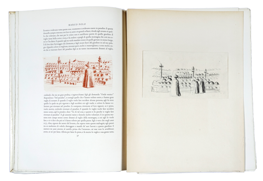 Polo Marco, Il Milione. Milano: Ulrico Hoepli, [1942] (Al colophon:) Verona: Officina Bodoni, 1942. In-folio (mm 410x295). Pagine [6] bianche, [2], 177, [3], [8] bianche, a bifoli sciolti, con 30 litografie originali di Massimo Campigli di cui 16 a piena pagina, stampate in nero, rosso e seppia. Esemplare in barbe, perfettamente conservato entro cartella editoriale illustrata, conservata entro cofanetto in cartonato, liso e con dorso parzialmente staccato. Uno dei 140 esemplari con numerazione araba, firmato a matita da Campigli al colophon, su una tiratura complessiva di 150 copie. Si aggiunge uno bozzetto preparatorio della litografia in rosso presente a pagina 32 dell'opera (mm 135x230), illustrato fronte-retro e parzialmente applicato al recto di un bifolio sciolto. Il disegno sul retro risulta più impreciso, ma con un'impostazione simile all'originale; il fronte, più dettaglio, si discosta a livello compositivo dall'originale per la mancanza delle figure in primo piano e i dettagli degli angoli in primo piano meno pronunciati, per la resa delle colonne e la presenza della cupola sullo sfondo. (1)Uno dei prodotti più belli dell'editoria d'Artista del periodo, nonché uno dei lavori grafici più apprezzati di Campigli. La cura e la tiratura delle pietre tipografiche fu affidata a Pietro Fornasetti. Jentsch, 105; Mardersteig 59.
