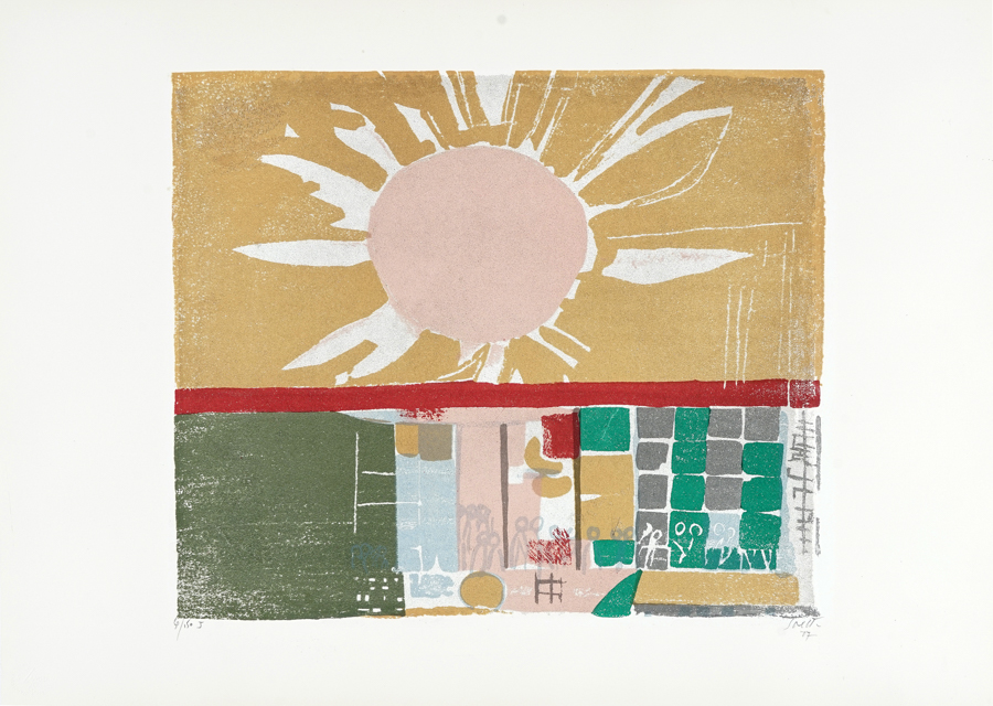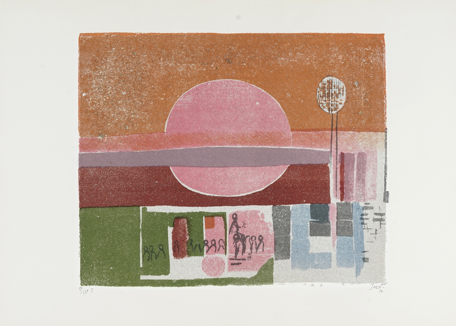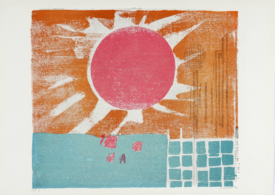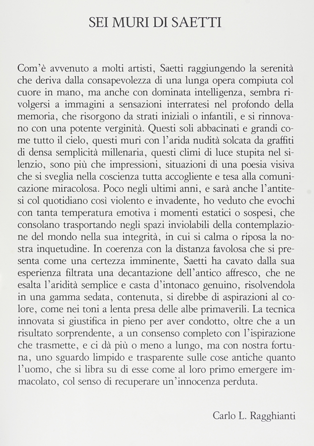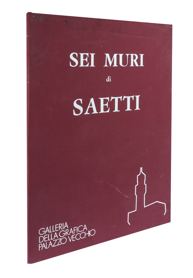 Saetti Bruno, Sei muri. 1977 Cartella in-folio (mm 710x510). 1 foglio di introduzione a cura di Carlo L. Ragghianti, 1 foglio di colophon e 6 belle litografie (mm 330x515 circa), ciascuna firmata e datata a matita in basso a destra e numerata a matita in basso a sinistra. Tutte le stampe recano timbro a secco "Stamperia artigiana d'arte Pistelli Firenze". Es. n. 50/150, una delle copie destinate al Giappone. Lieve brunitura delle veline, per il resto stato conservativo perfetto. Cartella editoriale in tela rossa con titolo impresso in bianco al piatto anteriore. (1)