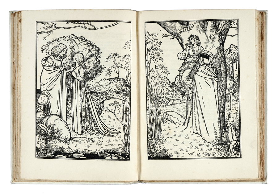 Shakespeare William, The tempest [...] decorated by Robert Anning Bell. London: Freemantle & Co, [1901]. In-4° (mm 240x170). Pagine [10], 106, [2]. Numerose illustrazioni in bianco e nero nel testo, anche a piena pagina. Copia impressa su carta forte, in barbe. Sporadiche e lievissime fioriture. Legatura editoriale originale in tela bianca con impressioni in nero a piatti e dorso. Dedica manoscritta in lingua tedesca datata 28/08/09 alla carta di guardia anteriore. (1)