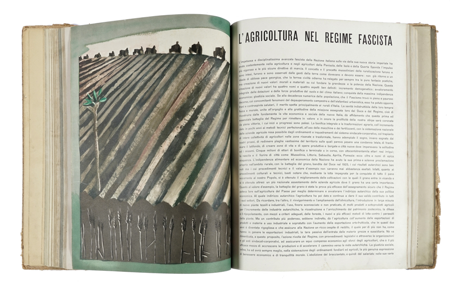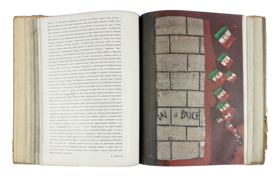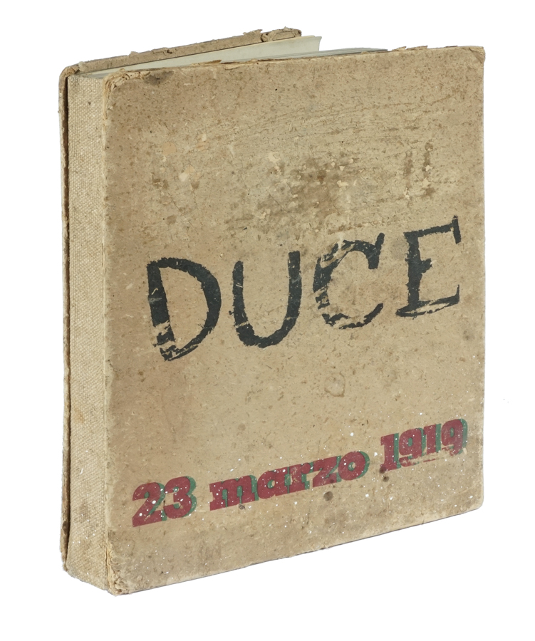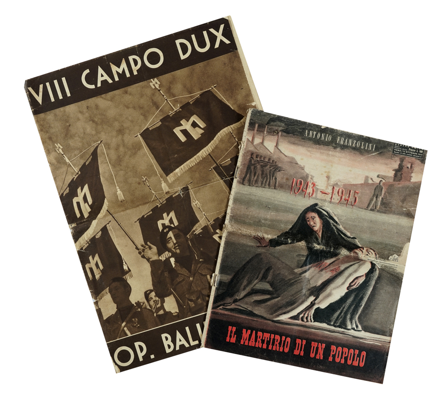 Sironi Mario, Viva il Duce. 23 marzo 1919. Milano: La Rivista Illustrata del Popolo d'Italia, 1939. In-folio (mm 380x305). Pagine [422] con 13 illustrazioni a piena pagina e colori fuori testo di Sironi. Restaurato l'ultimo fascicolo di testo, per il resto buono stato conservativo. Legatura editoriale originale con titolo impresso a due colori sul piatto anteriore. Mancanze ai piatti della legatura (abrasa parte del titolo). SI AGGIUNGONO: 2) Franzolini Antonio, 1943-1945 il martirio di un popolo. 3) VIII campo DUX - Op. Balilla A. XIV. Alcuni strappi e mancanze. 4-12) Raccolta di fotografie del periodo fascista, alcune in riproduzione. (12)