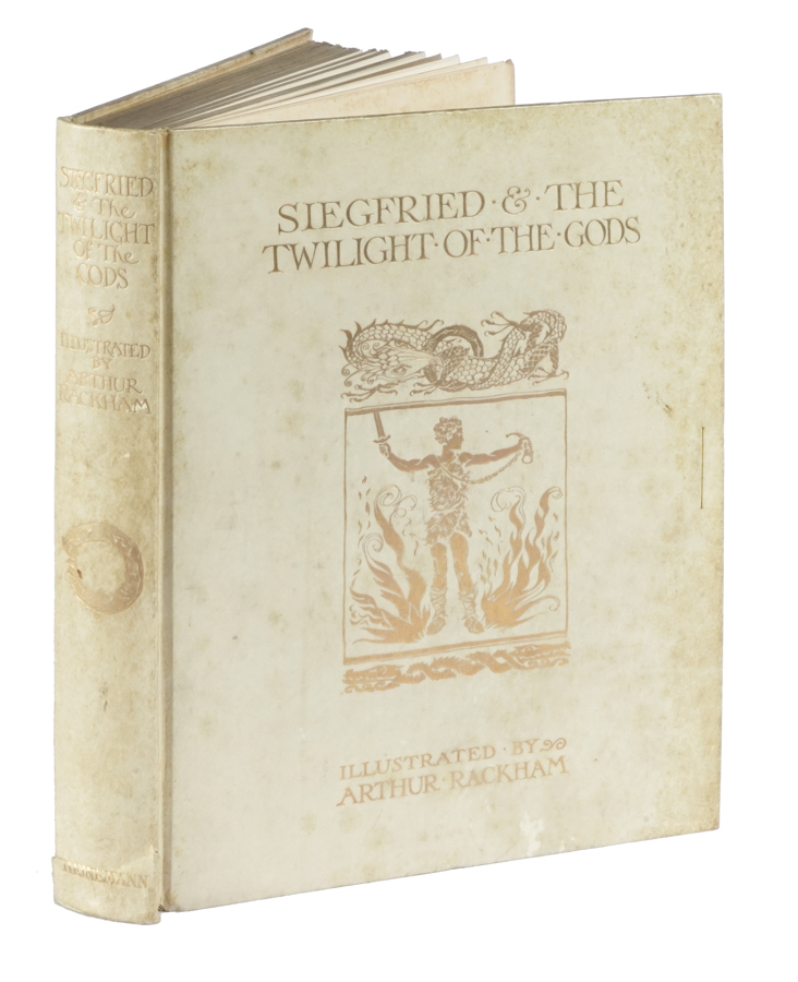 Wagner Richard, Siegfried & the twilight of the Gods [...] with illustrations by Arthur Rackham. Translated by Maragare Armour. London, New York: William Heinemann, Doubleday, Page & c°, 1911. In-4° grande (mm 288x230). Pagine IX, 1 bianca, 182, 1 bianca, [1] con 30 tavole a colori fuori testo, di cui una in principio, ciascuna montata su supporto e protetta da velina didascalica. Numerose illustrazioni nel testo. Brunitura della carta in corrispondenza delle tavole (causate dalla carta di supporto alle illustrazioni) per il resto ottima copia. Copia n. 184 su una tiratura complessiva di 1150 copie, firmata da Rackham sulla pagina di giustificazione. Legatura editoriale originale in piena pergamena rigida con titolo e illustrazione impressi in oro al dorso e al piatto anteriore. Piccolo difetto alla cuffia inferiore, alcune tracce di sporco, per il resto buono stato. Conservato il legaccio di seta originale a fine volume. Ex-libris di precedente proprietario al contropiatto anteriore. (1)