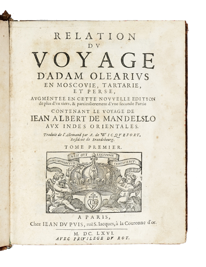 Olearius Adam, Relation du voyage [...] en Moscovie, Tartarie, et Perse, augmentee en cette nouvelle edition de plus d'un tiers. A Paris: chez Iean du Puis, rue S. Iacques, a la Couronne d'or, 1666.