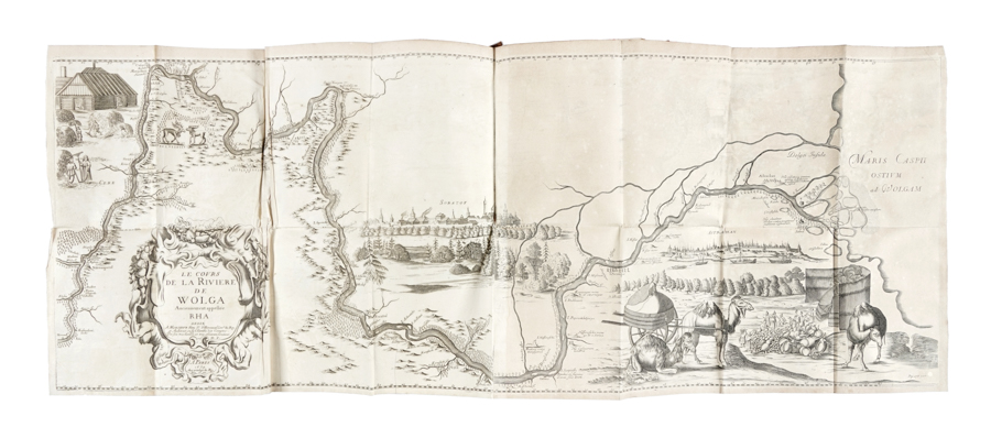 Olearius Adam, Relation du voyage [...] en Moscovie, Tartarie, et Perse, augmentee en cette nouvelle edition de plus d'un tiers, & particulierement d'une seconde partie, contenant le voyage de Jean Albert de Mandelslo aux Indes orientales. Traduit de l'allemand. A Paris: chez Iean du Puis, rue S. Iacques, a la Couronne d'or, 1666. 2 volumi in-4° (mm 235x180). Pagine [54], 586 [i.e. 576]; [46], 648 [i.e. 644] + 6 carte geografiche incise in rame fuori testo più volte ripiegate. Marca dello stampatore incisa in legno ai frontespizi, capilettera e testatine xilografici. Errori nella numerazione delle pagine ma testo ben completo. Esemplare discreto, con lievi bruniture sparse, tracce di arrossature e piccoli strappetti alle tavole, tuttavia marginali. Legatura coeva in piena pelle con titoli e decorazioni impresse in oro ai dorsi a 5 nervi, tagli marmorizzati. Piatti e dorsi un poco lisi. (2)Rara edizione francese di questi due importanti resoconti della spedizione commerciale tedesca alla corte dello Shah (1633-1639) voluta da Federico III di Holstein-Gottorp, tradotti dal tedesco da Abraham van Wicquefort. Con questo fondamentale testo Olearius introduce la cultura e la letteratura persiane in Europa, fornisce un interessante descrizione della Persia, della Tartaria e della Russia e, attraverso il racconto di Mandelslo rimasto inedito, del Madagascar, dell'India, del Giappone, della Cina (de l'Indosthan, de l'Empire du Mogul, des Isles de l'Orient, du Iapon, de la Chine...). Mandelslo, anch'egli membro della delegazione tedesca, nel 1638 aveva proseguito le esplorazioni spingendosi verso l'estremo oriente, ma non pubblicò mai il suo resoconto di viaggio, edito postumo da Olearius come appendice alla propria opera. Di notevole interesse le belle mappe che accompagnano il testo, in particolar modo la grande pianta che illustra il percorso del fiume Volga.