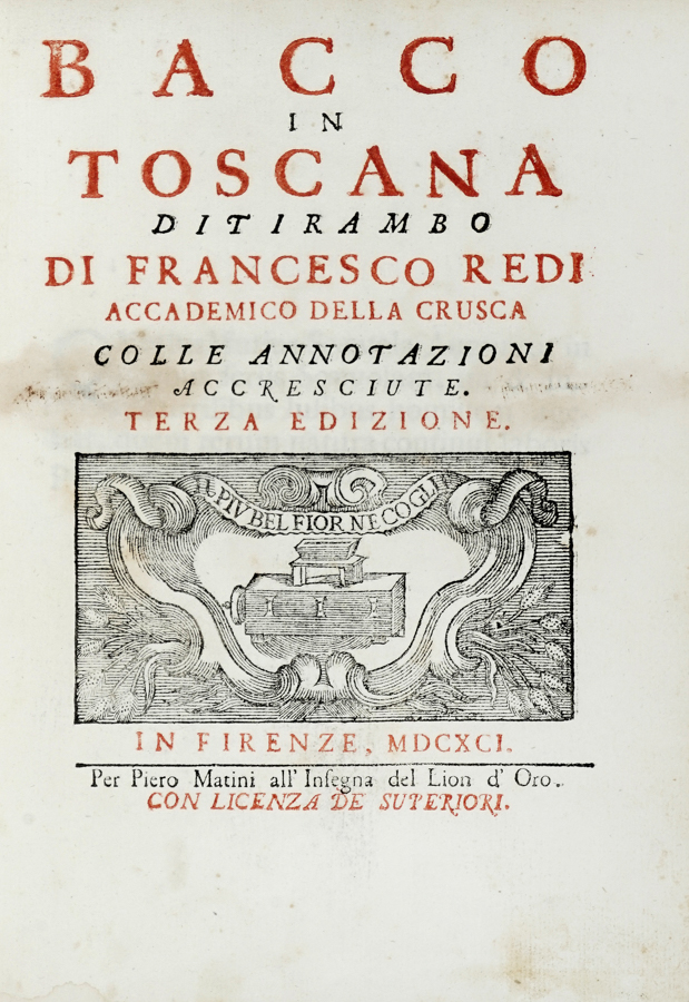 Redi Francesco, Bacco in Toscana. Ditirambo [...] colle annotazioni accresciute. Terza edizione. In Firenze: Per Piero Matini all'Insegna del Lion d'Oro, 1691.