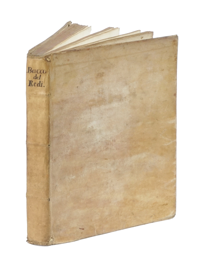 Redi Francesco, Bacco in Toscana. Ditirambo [...] colle annotazioni accresciute. Terza edizione. In Firenze: Per Piero Matini all'Insegna del Lion d'Oro, 1691. In-4° (mm 243x172). Pagine [8], 46, [2], 251, [1]. Frontespizio in rosso e nero con marca tipografica xilografica della Crusca. Ottimo esemplare. Copia con alcune fioriture marginali, nel complesso in buono stato. Legatura in piena pergamena con titolo manoscritto al dorso. Piccolo timbro di precedente collezione privata al contropiatto anteriore. (1)Terza edizione notevolmente ampliata. Esemplare proveniente dall'importante biblioteca Landau. Gamba, 828; Prandi, Redi, 51: «Non comune»; Westbury,185.