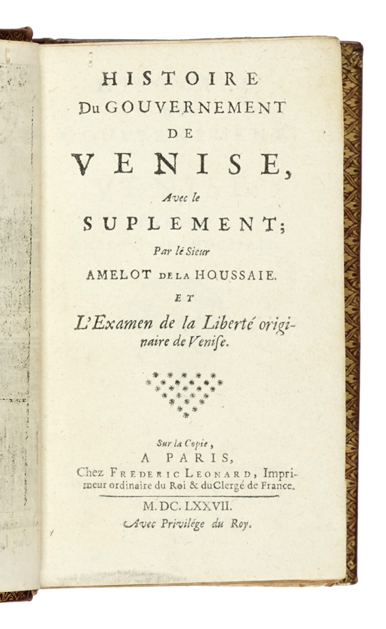 Amelot de la Houssaye Abraham Nicholas, Histoire du gouvernement de Venise, avec le suplement. A Paris: chez Frederic Leonard, 1677.