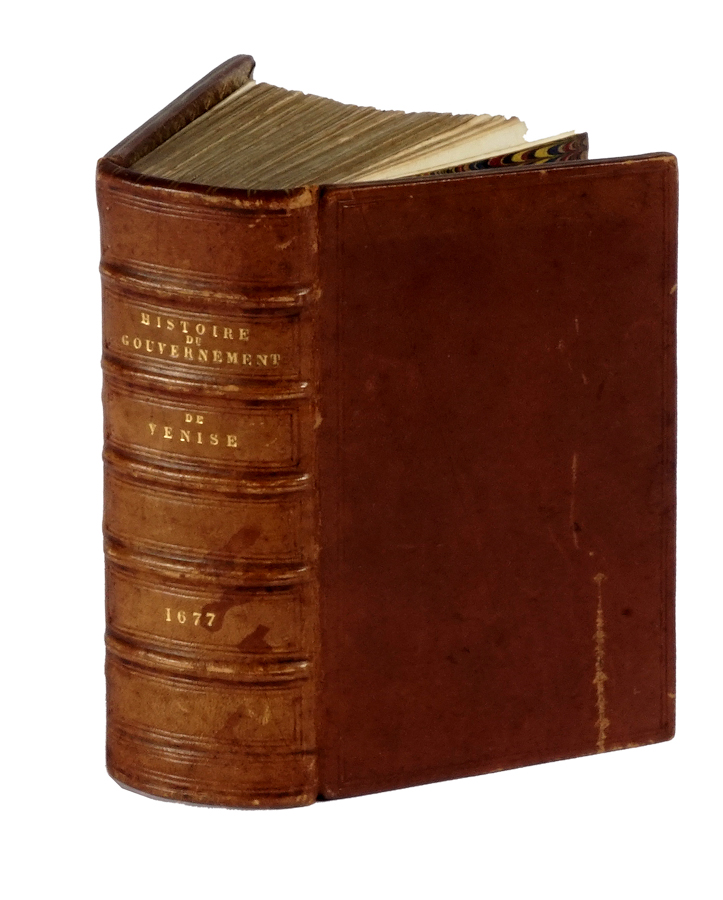 Amelot de la Houssaye Abraham Nicholas, Histoire du gouvernement de Venise, avec le suplement. A Paris: chez Frederic Leonard, 1677. 2 parti in 1 volume in-12° (mm132x75). Pagine [24], 550, [38]; 237, [3]. Antiporta calcografica al primo volume. Ottima copia, con solo occasionali strappetti, ma ben conservata. Legatura in piena pelle con titoli impressi in oro al dorso, dentelles dorate alle unghiature e sguardie in carta decorata. (1)Rara seconda edizione. Cicogna 1092; Lozzi II, 5865 cita la prima.