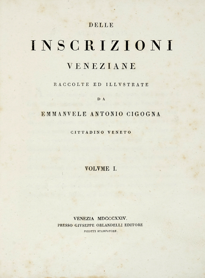Cicogna Emanuele Antonio, Delle inscrizioni veneziane... Fascicoli 1-21, 23-26. Venezia: presso Giuseppe Orlandelli editore, Picotti stampatore, 1824-53.