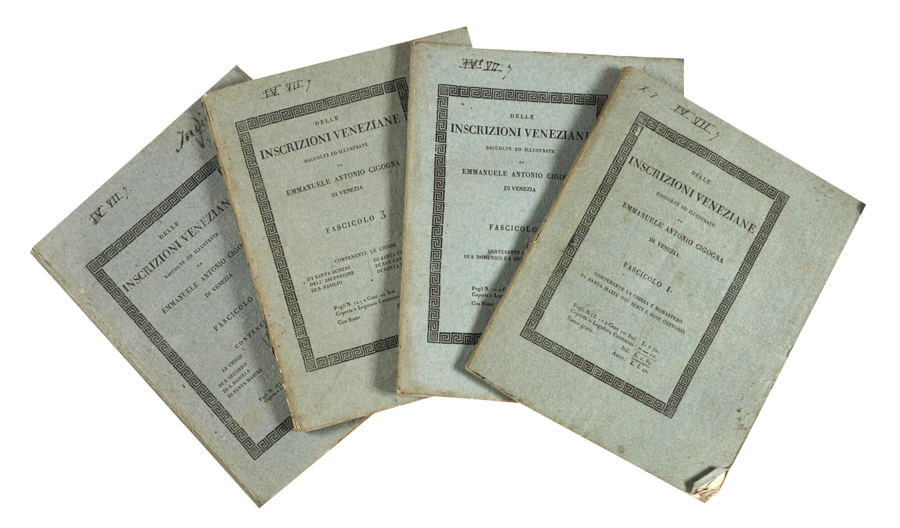 Cicogna Emanuele Antonio, Delle inscrizioni veneziane... Fascicoli 1-21, 23-26. Venezia: presso Giuseppe Orlandelli editore, Picotti stampatore, 1824-53. 6 volumi in 25 (di 26) fascicoli in-4° (mm 310x230). Assente il fascicolo 22 (parte del volume 6), presenti i fascicoli 25 e 26, contenenti rispettivamente Le correzioni e giunte ai fascicoli precedenti e le Correzioni e giunte finali a tutti li sei volumi. Fascicoli in barbe. Brossura editoriale originale in carta azzurrina con titoli impressi entro cornice al piatto anteriore. Mancanze e spellature lungo i dorsi e le cuffie. (25)Prima edizione ancora in forma di fascicoli di questo splendido repertorio sulle iscrizioni delle chiese e monumenti di Venezia a opera dell'erudito Emanuele Antonio Cicogna. Graesse II 186; Soranzo 8812.
