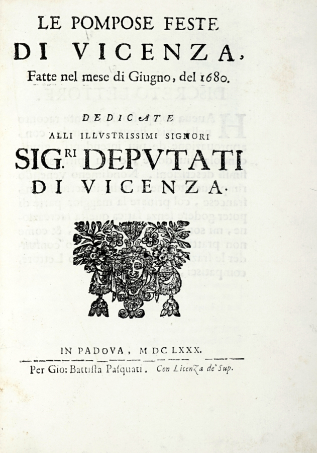 Patin Charles, Le pompose feste di Vicenza, fatte nel mese di giugno, del 1680. Dedicate alli illustrissimi signori sig.ri Deputati di Vicenza. In Padova: per Gio. Battista Pasquati, 1680.