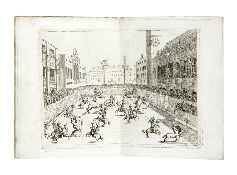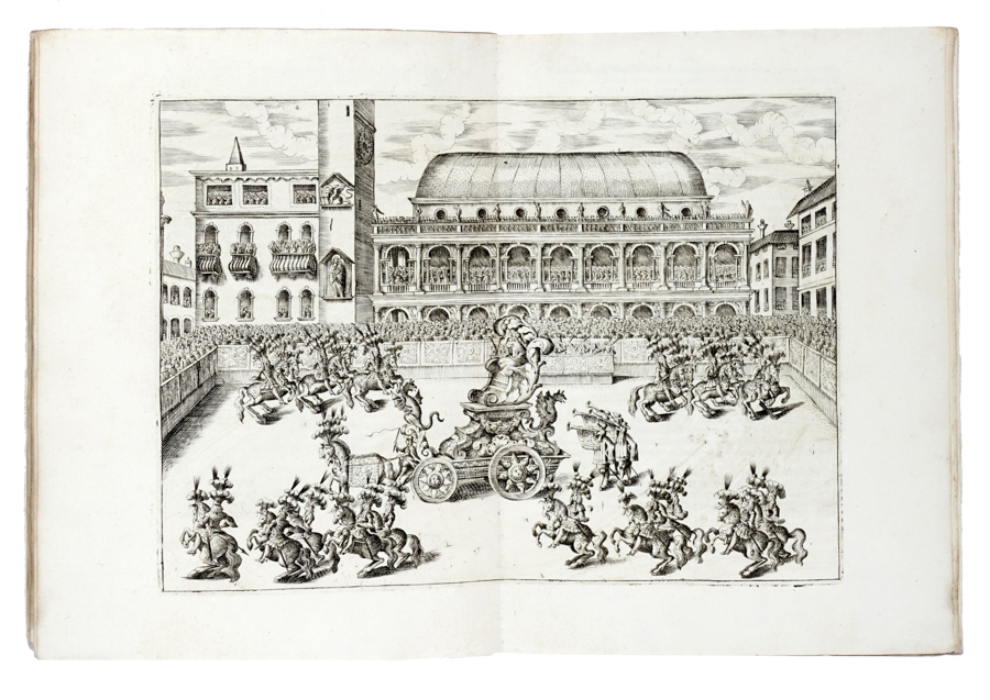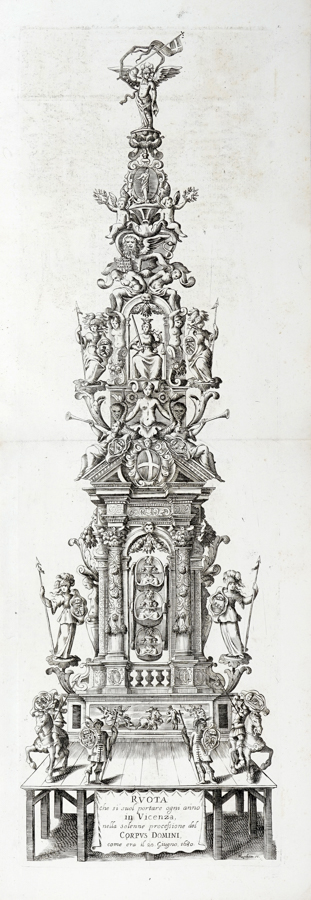 Patin Charles, Le pompose feste di Vicenza, fatte nel mese di giugno, del 1680. Dedicate alli illustrissimi signori sig.ri Deputati di Vicenza. In Padova: per Gio. Battista Pasquati, 1680. In-4° (mm 246x185). Pagine [4], 95-113, 1 bianca con 3 tavole calcografiche, di cui 2 a doppia pagina e 1 ripiegata, oltre a numerose illustrazioni, fregi e iniziali incise in rame e legno nel testo. Splendida copia, marginosa e fresca, con rare e lievissime fioriture a poche carte. Brossura coeva in cartonato marmorizzato. (1)Splendida edizione che illustra la festa del Corpus Domini vicentina. Per l'occasione erano istituiti tornei, banchetti e balli, una processione religiosa e una corsa di cavalli; la vera attrazione era però rappresentata dall'imponente Ruota alta cinquanta braccia, dedicata alla devozione della Santa Croce e raffigurata in una delle illustrazioni del volume. L'opera è completa e autonoma, seppur la sua paginazione inizi da p. 91. Berlin Kat. 3051; Lipperheide 2792; Ruggieri 821.