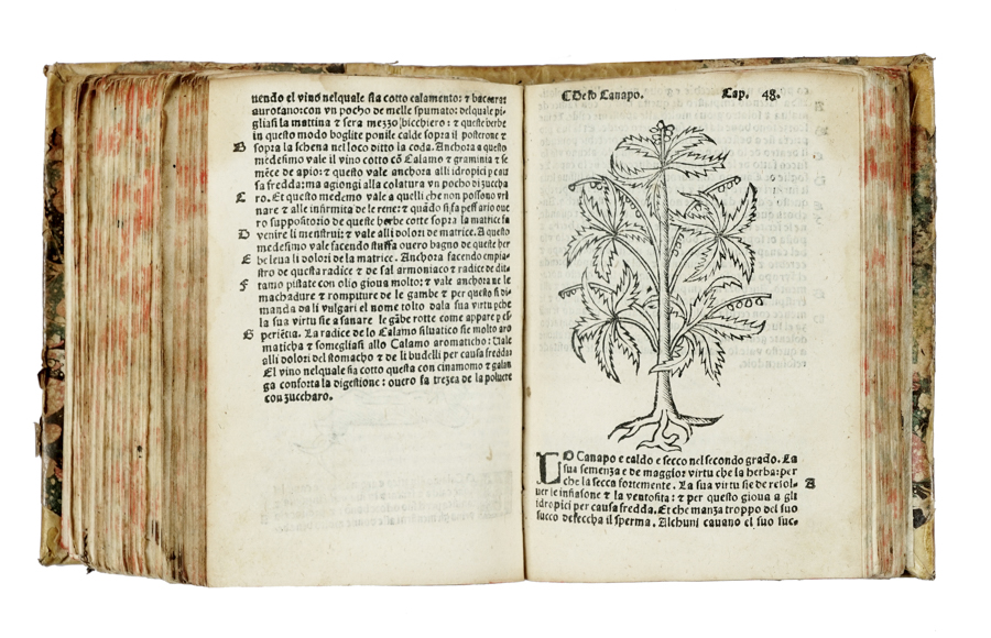 Arnaldo de Vilanova, Herbolario volgare, nel quale se dimostra a conoscer le herbe... (Al colophon:) Stampato in Venetia: per Giovanni Maria Palamides nevodo di Giovane Tacuino, 1539. In-8° (mm 151x106). Carte [6], 151 [i. e. 148], [20] di [23]. Con oltre 100 illustrazioni xilografiche di piante a tre/quarti nel testo, 1 grande legno raffigurante i santi Cosma e Damiano al frontespizio con titoli impressi in rosso e nero con, 1 xilografia a piena pagina con l'Annunciazione a carta AA6v. Copia scompleta di 6 carte (E4, E5, F1, e le ultime 3 in fine), rifilata e con fioriture diffuse e macchie. PRECEDUTO DA: Dioscorides Pedanius, [Della materia medicinale]. (Al colophon:) Stampato in Fiorenza: appresso Bernardo di Giunti, del mese di Genaio 1546. Carte 306 [i.e. 305]. Marca xilografica sul frontespizio. Copia priva delle prime due carte e della carta A8, con numerosi errori di numerazione. Gore marginali, arrossature e tracce d'uso a gran parte delle pagine. Legatura successiva in mezza pergamena con punte e piatti in carta marmorizzata. Titolo manoscritto al dorso. Il Dioscoride presenta postille di mano antica nel testo. (1)I OPERA: Rara quarta edizione volgare. Cfr. Choulant, Graphische incunabeln 17; Durling 2272; Nissen, BBI 2318; Pritzel 10766; Sander 619. II OPERA: Variante B censita da OPAC.