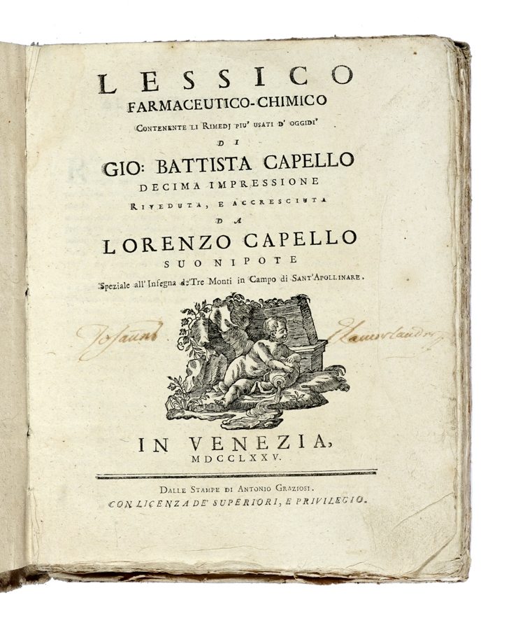 Capello Giovanni Battista, Lessico farmaceutico-chimico contenente li rimedj piu usati d'oggidi. In Venezia: dalle stampe di Antonio Graziosi, 1775.