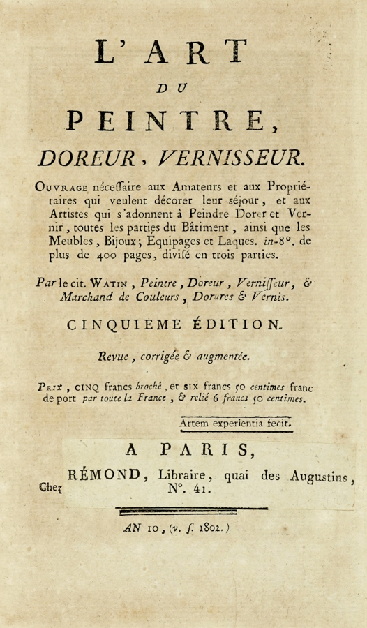 Klaproth Martin Heinrich, Dizionario di chimica... Tomo primo (-quarto). Milano: per Francesco Sonzogno di Gio. Battista, 1811-1814. 4 volumi in-8° (mm 197x127). Con, nel complesso, un'antiporta all'inizio del primo volume e 8 tavole fuori testo. Buono stato complessivo. Legatura coeva in cartonato con titoli in oro su tassello al dorso. SI AGGIUNGE: Watin, L'art du peintre, doreur, vernisseur [...] cinquième edition... A Paris: Rémond, 1802. (5)