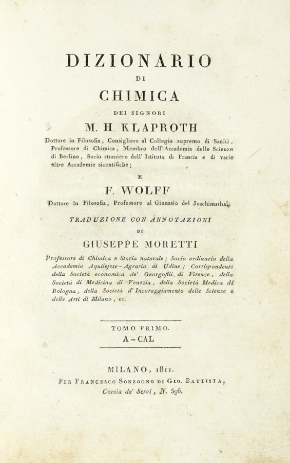 Klaproth Martin Heinrich, Dizionario di chimica... Tomo primo (-quarto). Milano: per Francesco Sonzogno di Gio. Battista, 1811-1814.
