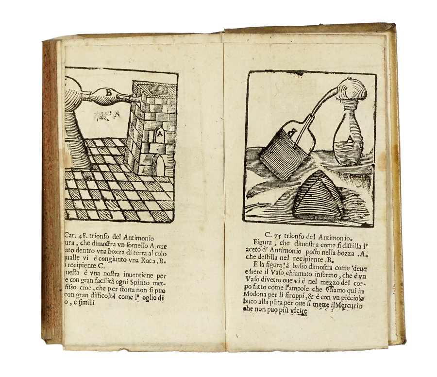 Lancillotti Carlo, Farmaceutica antimoniale (-Farmaceutica mercuriale). In Modona: per gli eredi Soliani, 1683. 2 parti in 1 volume in-12° (mm 140x75). Pagine 35, 1 bianca, 287 con 2 tavole fuori testo ripiegate; [2], 8, 2 bianche, 208 con 4 tavole xilografiche, di cui 1 antiporta. Copia mal rilegata: i frontespizi delle due opere sono stati invertiti, l'antiporta del primo volume è stata rilegata in fondo. Tavole ripiegate con piccoli strappi e mancanze marginali, tavole a piena pagina rifilate con perdita di piccola porzione d'inciso nei margini. Legatura in piena pergamena rigida con titoli manoscritti al dorso e tagli spruzzati. Copia da studio, lotto non passibile di restituzione. (1)Rarissime edizioni originali di queste opere alchemiche e mediche in cui il Lancillotti esalta le proprietà del metallo come rimedio per la cura di molte malattie, in particolare della sifilide. Apologia del mercurio, l'opera è pertanto ricca di citazioni dei più grandi medici greci e arabi, che lo adoperavano tanto nella sua forma cruda, quanto in quella composta. Tiraboschi, III, 70.