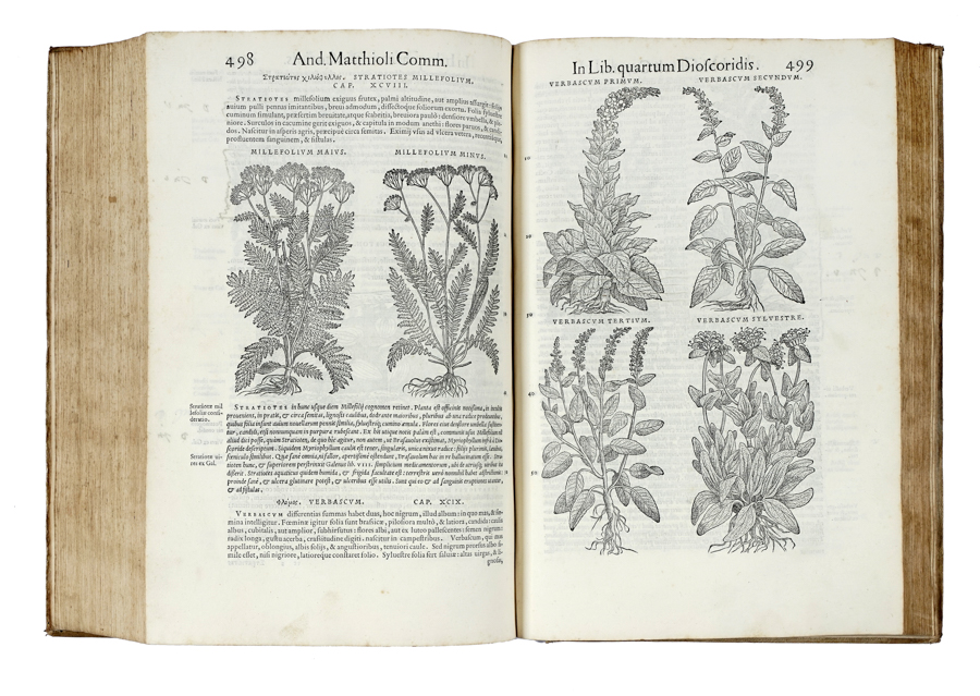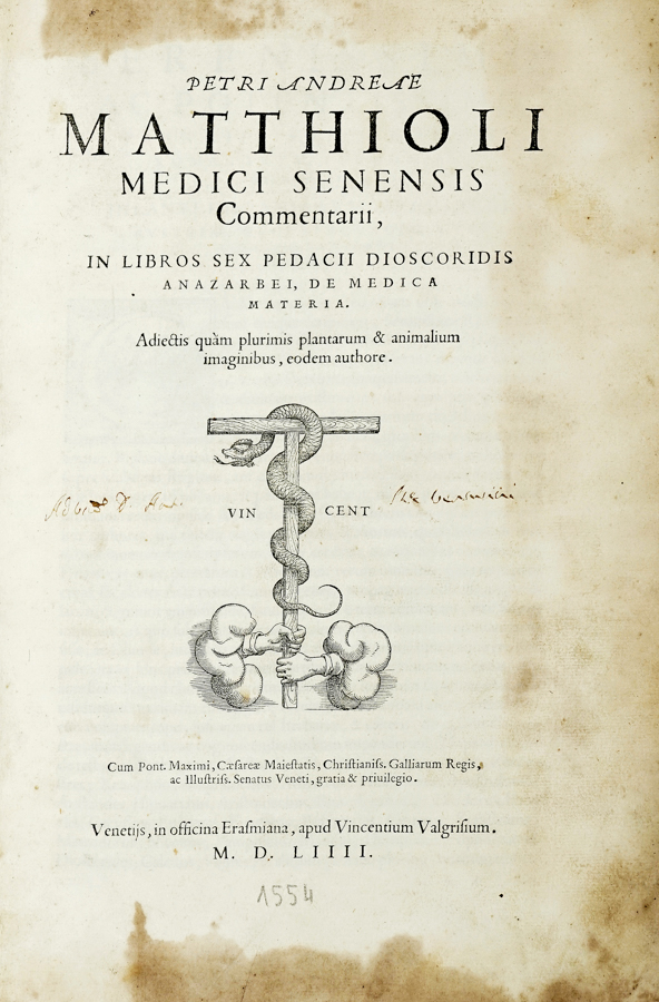 Mattioli Pietro Andrea, Commentarii in libros sex Pedacii Dioscoridis [...] Adiectis quam plurimis plantarum & animalium imaginibus... Venetiis: in officina Erasmiana, apud Vincentium Valgrisium, 1554.