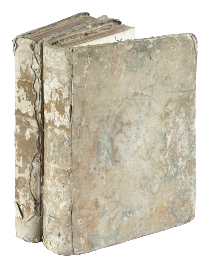 Berthoud Ferdinand, Histoire de la mesure du temps par les horloges... Tome premier (-second). A Paris: de l'imprimerie de la République, 1802. 2 volumi in-4° (mm 255x195). Pagine XXVIII, 373, [1], 2 bianche con 8 tavole ripiegate fuori testo numerate I-VIII; [4], XVI, 447, [1] con 15 numerate IX-XIII rilegate in fine volume. L'occhietto del primo volume e le tavole IX-X si trovano erroneamente rilegate nel secondo, ma presenti. Primo volume con gora e lavoro di tarlo nel margine inferiore della prima metà dei fascicoli, alcuni restauri alle tavole del secondo, altri minori difetti conservativi. Legatura in tela rivestita in cartone decorato. Mancanze a piatti e dorso. (2)Prima edizione di questo trattato sulla misura del tempo attraverso gli orologi. Brunet VI, 8393; Houzeau and Lancaster 10217: «ouvrage intéressant».