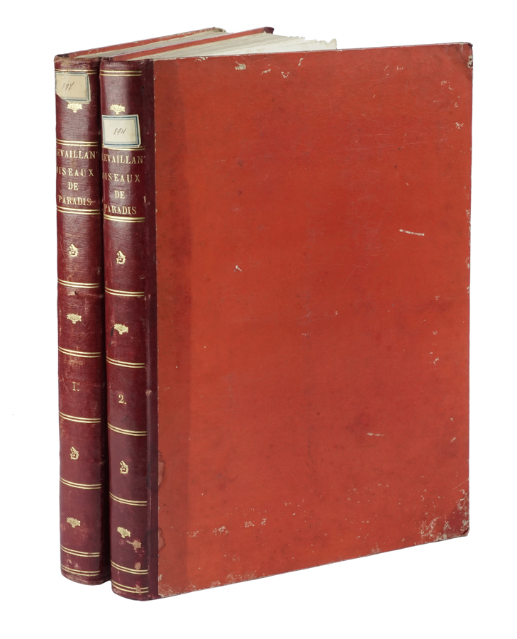 Levaillant François, Histoire naturelle des oiseaux de paradis et des rolliers, suivie de celle des Toucans et des Barbus. Tome premier (-second). Paris: Denné le jeune et Perlet, 1806. 2 volumi in folio grande (mm 524x340). Pagine [4], 7, 1 bianca, 153, [1], II con 56 tavole fuori testo, di cui 2 ripiegate; [4], 48, 43-133, [5], II con 58 tavole fuori testo. Con, nel complesso, 114 splendide tavole incise a partire da disegni di Jacques Barraband e ritoccate all'acquerello. Rarissime carte con sporadiche fioriture, brunite alcune delle veline protettive, rimontate le tavole 51 e 55 del secondo volume ma nel complesso splendida copia, marginosa, fresca e con le tavole ottimamente conservate. Bella legatura coeva in mezzo marocchino rosso con piatti in carta colorata. Titolo e decorazioni a motivo ornitologico impressi in oro a ciascun dorso. Etichetta di precedente collocazione in corrispondenza della cuffia esterna di entrambi i volumi. (2)Prima edizione. Le tavole, su disegno di Barraband, sono state incise da Perée e Gremilliet e impresse a colori da Langlois and Rousset à la poupée, inchiostrando cioé un'unica lastra con diversi colori prima dell'impressione. Le illustrazioni di Barraband, «considered among the best bird artists of the time» (Jackson, Great Bird Paintings of the World: The eighteenth century) riproducono numerose specie di uccelli del paradiso e tucani e spiccano per precisione e fedeltà dei colori. Fine Bird Books, p. 118; Nissen IVB 559; Ronsil 298. Per la collaborazione tra Levaillant e Barraband si veda il lotto precedente.