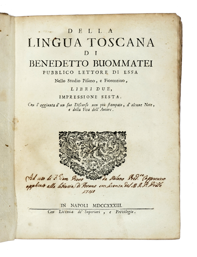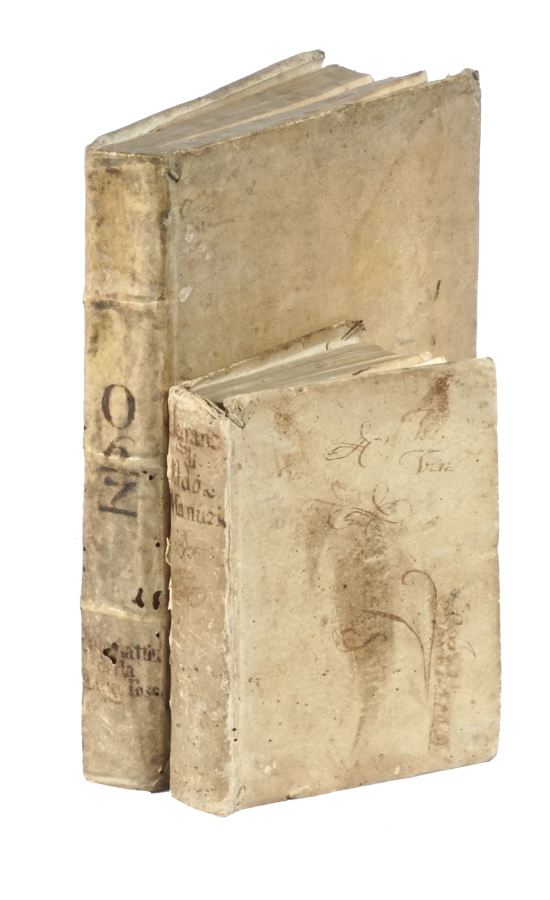 Manuzio Aldo, Eleganze, insieme con la copia della lingua toscana, e latina... In Venetia: [Paolo Manuzio], 1563. In-8° (mm 138x90). Carte 192. Marca aldina al frontespizio. Copia gorata, con piccoli lavori di tarlo alle ultime carte di volume. Legatura in pieno cartonato con titolo manoscritto al dorso. Alcune note di possesso manoscritte, in parte cancellate, sul frontespizio. SI AGGIUNGE: Buonmattei Benedetto, Della lingua toscana [...] libri due. In Napoli: s.e., 1733. In-4° (mm 225x168). Alcune fioriture. Legatura in piena pergamena rigida con titolo manoscritto al dorso. (2)I OPERA: Renouard, 189 n. 7; Brunet IV, 1385.