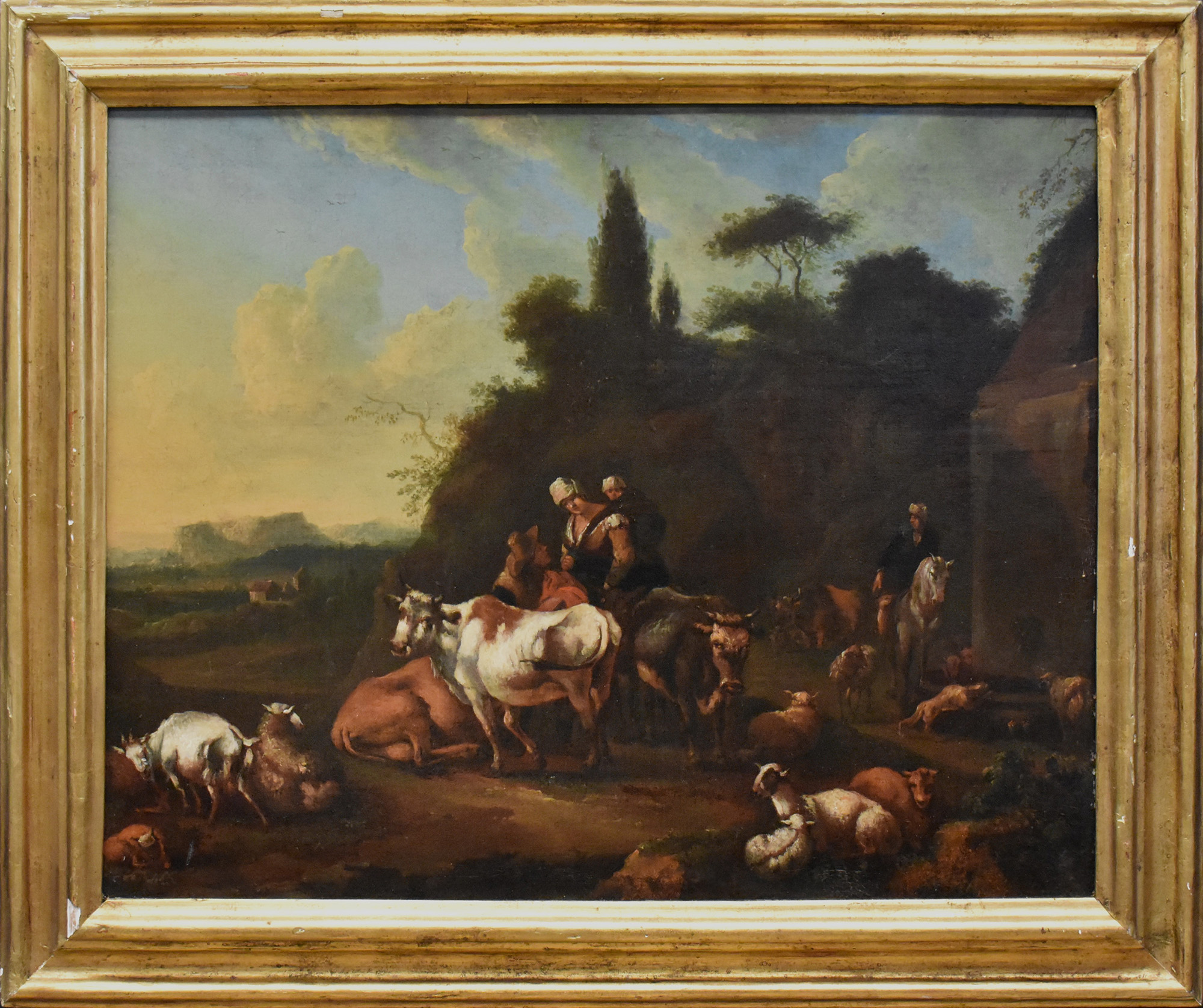 Olio su tela "Paesaggio con personaggi e armenti" sec.XVIII