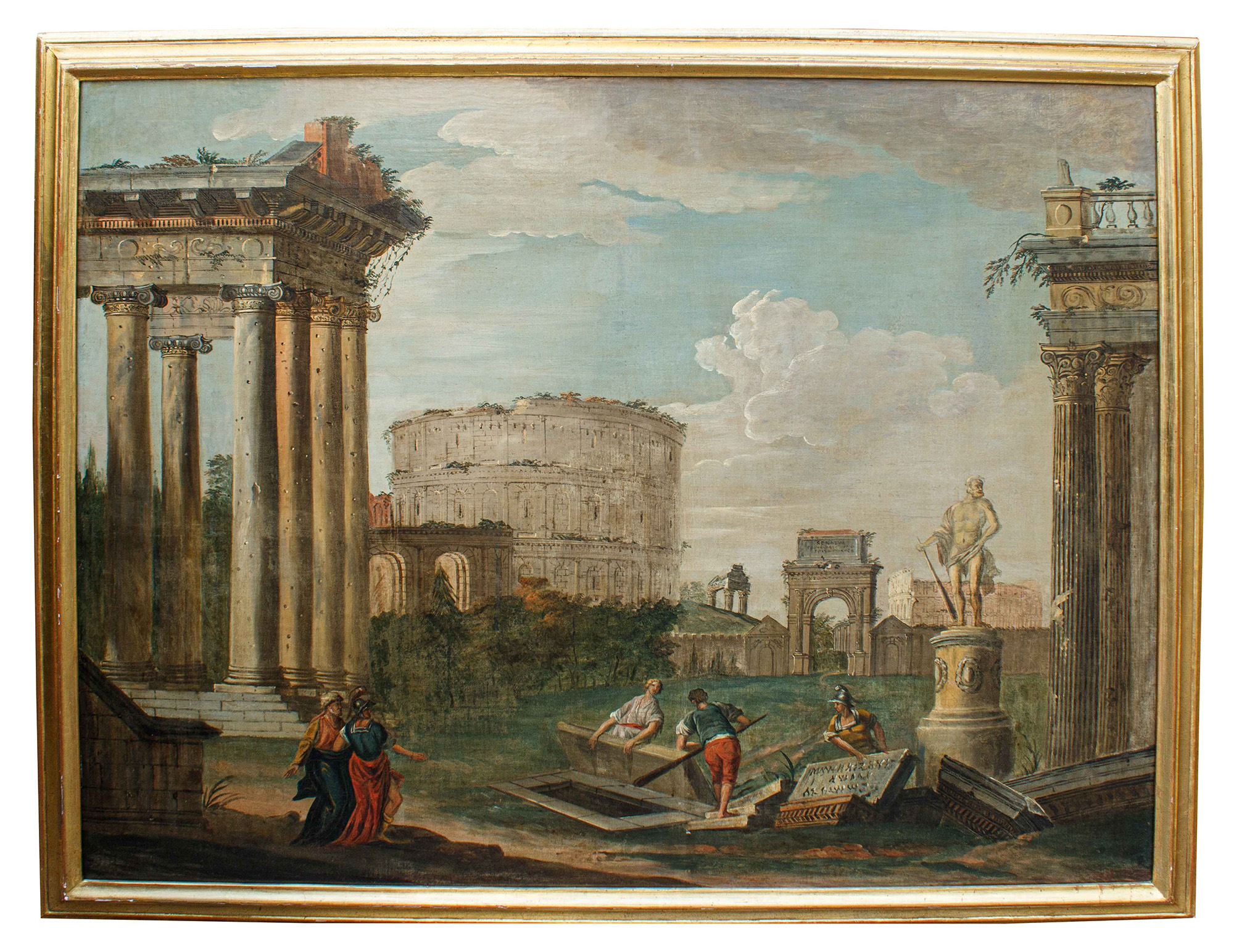 "Scena di trafugamento con rovine romane" olio su tavola, seguace di Antonio Joli (Modena 1700 - Napoli 1777)