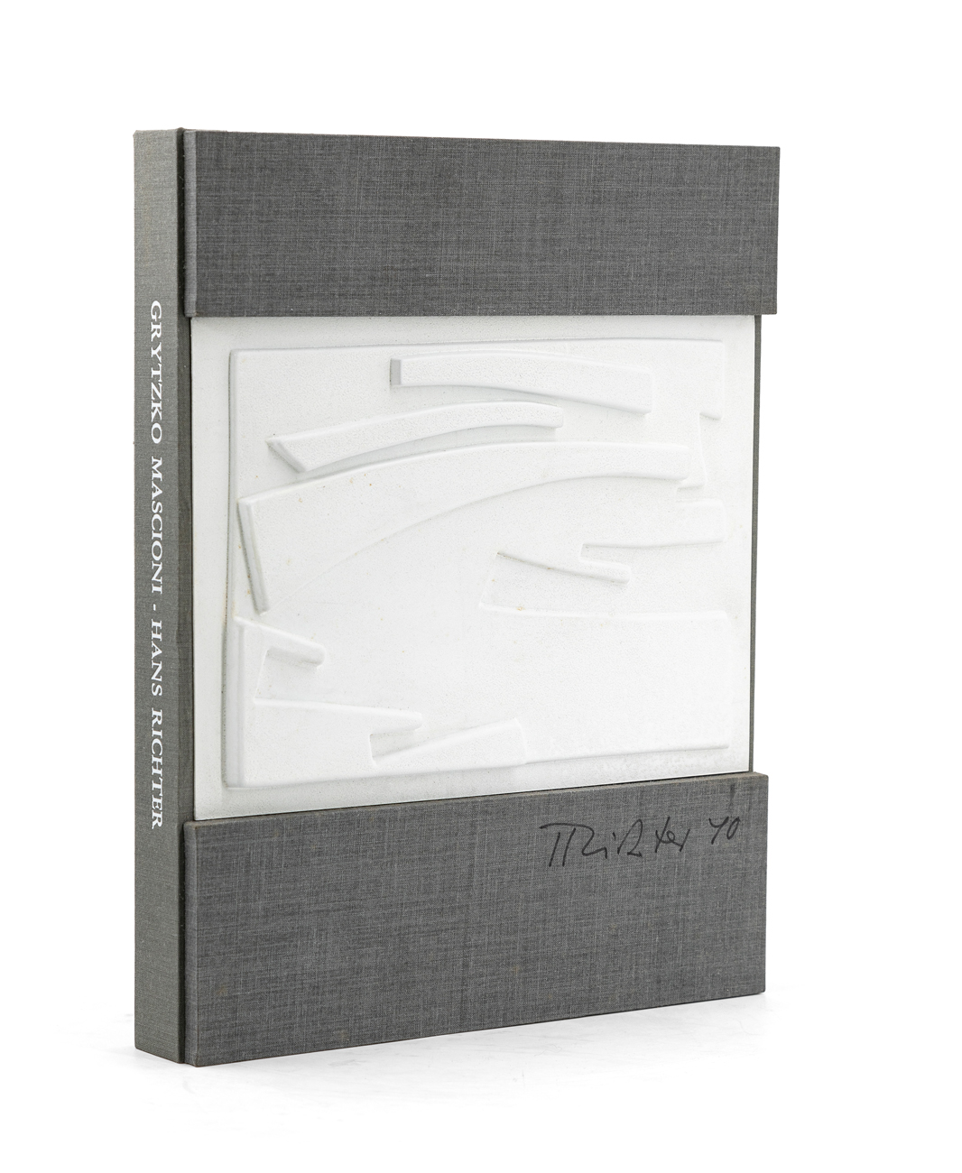 Astuccio telato con multiplo in plastica recante firma e datazione a pennarello di Hans Richter contenente 6 poesie di Grytzko Mascioni e 6 acqueforti di Hans Richter