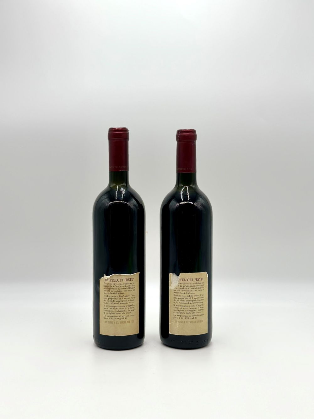 a) Puglia, Cappello di Prete IGT - 1 bottiglia (bt), annata 1987. Livello: collo inferiore (BN), nella norma per i vini di qualsiasi età. Condition report: etichetta e capsula con lievi segni d'usura del tempo. b) Puglia, Cappello di Prete IGT - 1 bottiglia (bt), annata 1987. Livello: collo inferiore (BN), nella norma per i vini di qualsiasi età. Condition report: etichetta e capsula con lievi segni d'usura del tempo.