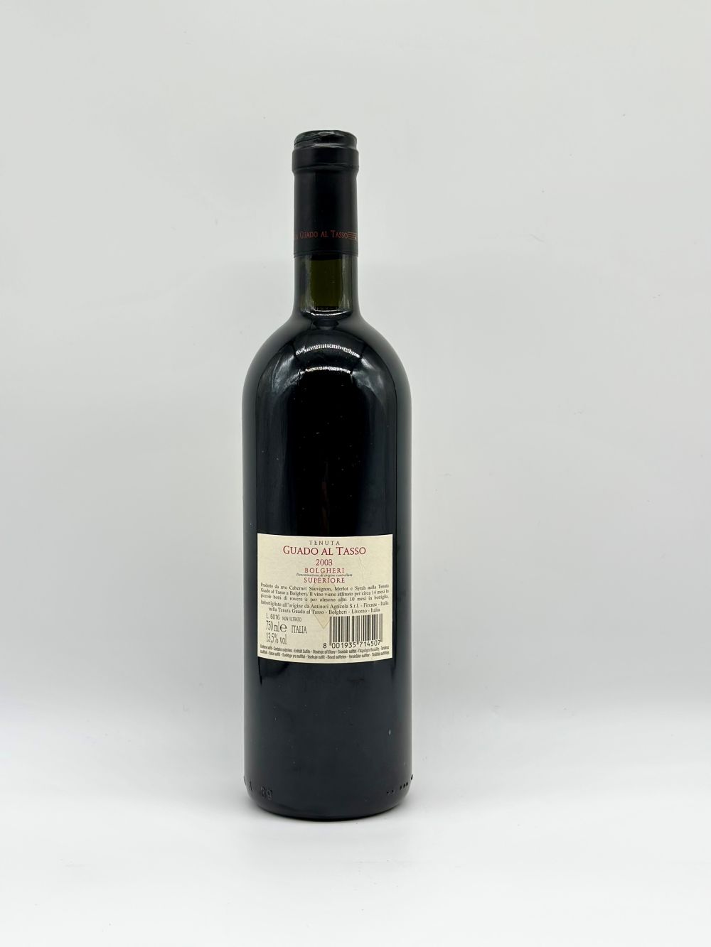Toscana, Bolgheri Superiore DOC - 1 bottiglia (bt), annata 2003. Livello: collo inferiore (BN), nella norma per i vini di qualsiasi età. Condition report: etichetta e capsula in perfette condizioni.