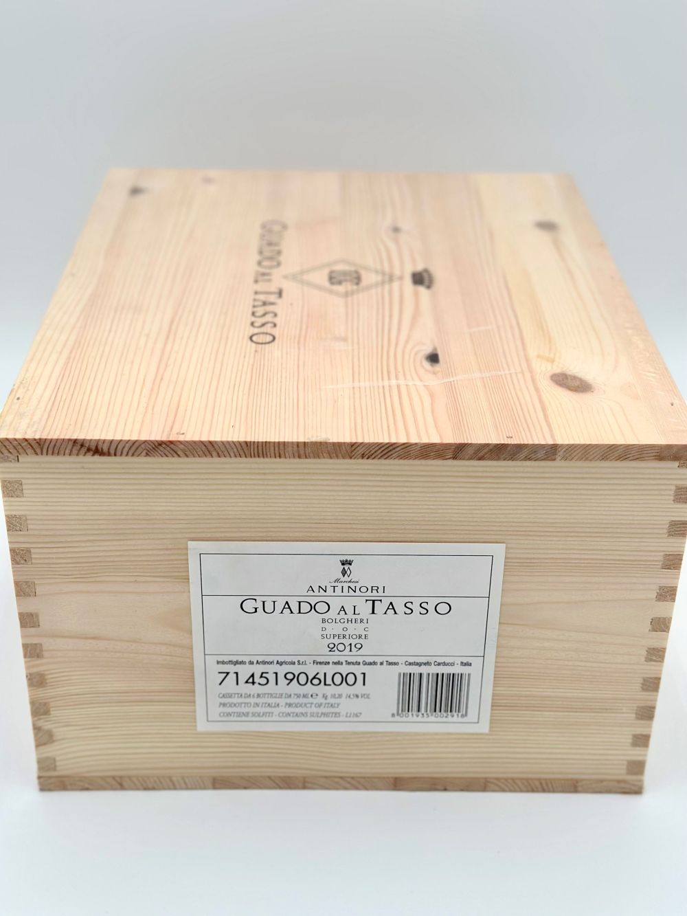 Toscana, Bolgheri Superiore DOC - 6 bottiglie (bt), annata 2019. Livello: entro il collo (WN), livello di colmatura standard. Confezione: scatola di legno originale (OWC), ancora regettata. Condition report: etichetta e capsula in perfette condizioni.