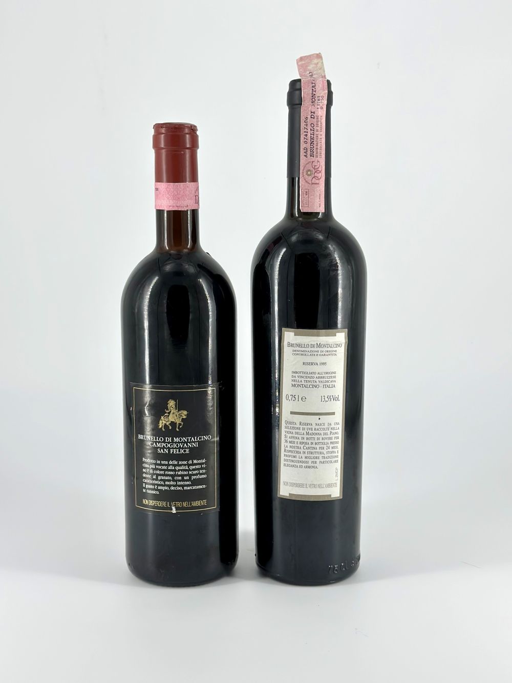 a) Toscana, Brunello di Montalcino DOCG - 1 bottiglia (bt), annata 1986. Livello: sommità della spalla (TS), livello normale per i vini di oltre 15 anni d'età. Condition report: etichetta e capsula in ottime condizioni. b) Toscana, Brunello di Montalcino DOCG - 1 bottiglia (bt), annata 1995. Livello: collo inferiore (BN), nella norma per i vini di qualsiasi età. Condition report: etichetta e capsula in ottime condizioni.