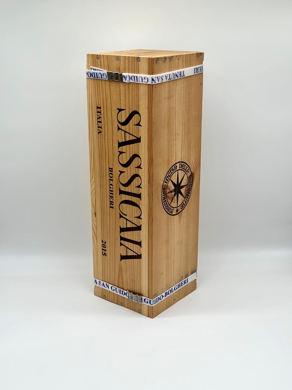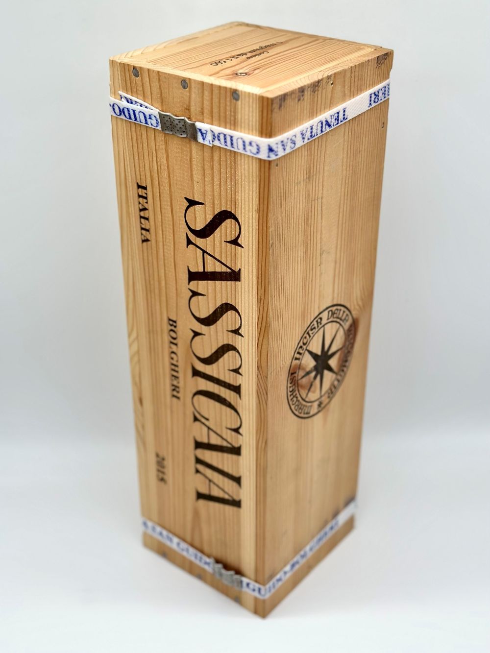 Toscana, Sassicaia DOC - 1 Magnum (Mg), annata 2015. Livello: entro il collo (WN), livello di colmatura standard. Confezione: scatola di legno originale (OWC), ancora sigillata. Condition report: etichetta e capsula in perfette condizioni.