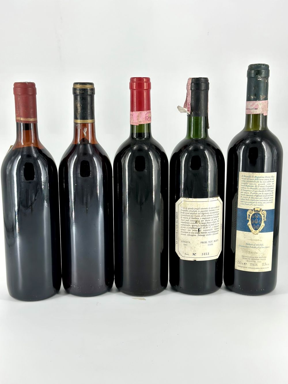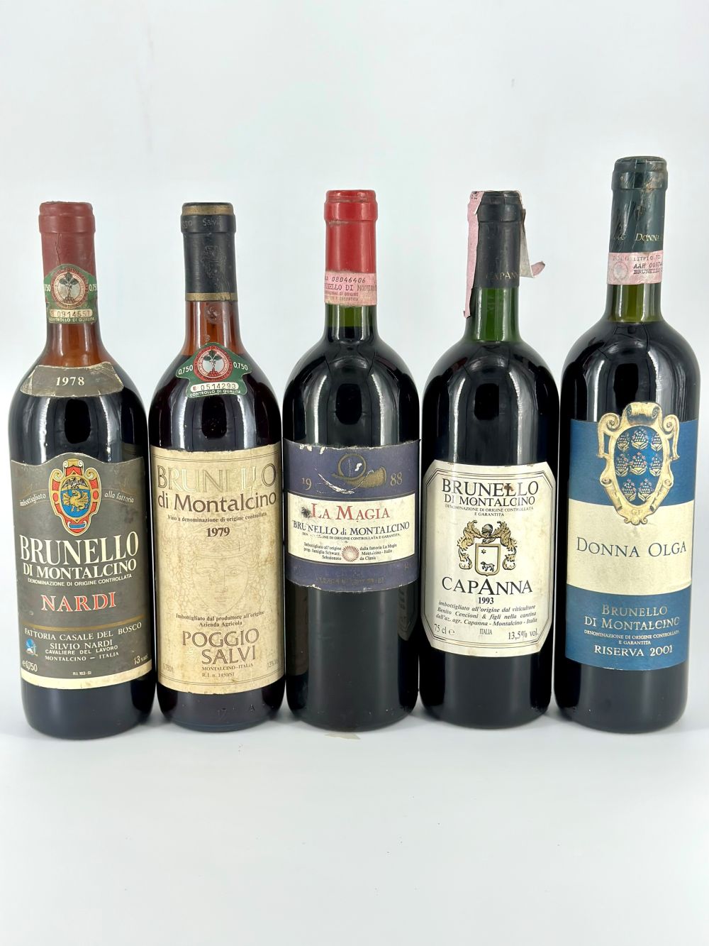 a) Toscana, Brunello di Montalcino DOC - 1 bottiglia (bt), annata 1978. Livello: spalla media (MS), normale per i vini di 20 anni d'età. Condition report: etichetta e capsula in buone condizioni. b) Toscana, Brunello di Montalcino DOC - 1 bottiglia (bt), annata 1979. Livello: spalla (S), livello normale per i vini fra i 10 e i 15 anni d'età. Condition report: etichetta e capsula in buone condizioni. c) Toscana, Brunello di Montalcino DOCG - 1 bottiglia (bt), annata 1988. Livello: collo inferiore (BN), nella norma per i vini di qualsiasi età. Condition report: etichetta e capsula con segni d'usura del tempo. d) Toscana, Brunello di Montalcino DOCG - 1 bottiglia (bt), annata 1993. Livello: sommità della spalla (TS), livello normale per i vini di oltre 15 anni d'età. Condition report: etichetta e capsula in buone condizioni. e) Toscana, Brunello di Montalcino DOCG - 1 bottiglia (bt), annata 1993. Livello: sommità della spalla (TS), livello normale per i vini di oltre 15 anni d'età. Condition report: etichetta e capsula in ottime condizioni.