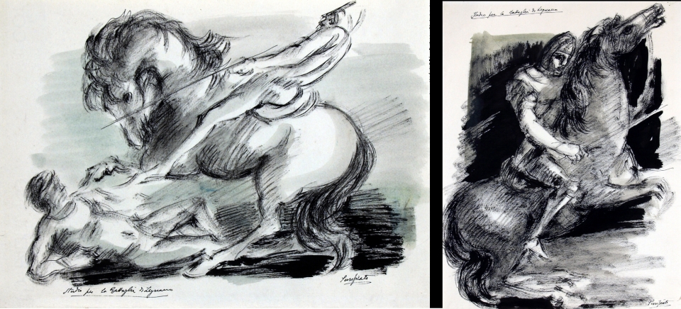 "LOTTO DI 2 OPERE" china su cartoncino cm. H: 35.00 L: 25.00 A) "Studio per la battaglia di Legnano", china colorata su cartoncino cm. 35x25. Firma in basso a destra. Titolo in basso a sinistra.