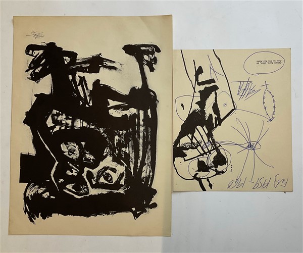 Lotto composto da una litografia firmata e datata 1959 e un biglietto di auguri stampato, ritoccato a penna e firmato dall'artista, misure diverse