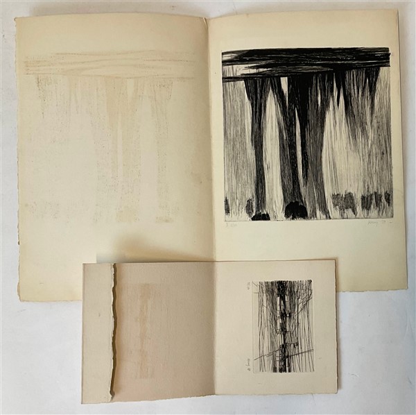 Lotto composto da una puntasecca stampata su un quartino (lastra cm 17x17) firmata, datata '59 e numerata II 5/50 in basso a matita, edita dalla Gallerie Arnaud, Parigi e un biglietto di auguri con piccola puntasecca (lastra cm 6x9) firmata, datata '58, numerata 98/150 e dedicata