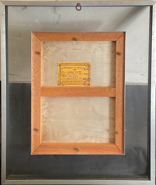 firmato in basso a destra; etichetta della galleria al verso con i dati dell'opera, es. P.A.. In cornice (difetti)