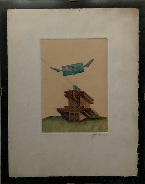 Lotto composto da un'acquaforte a colori di Massimo Scolari (foglio cm 32x25) firmata e datata 1979 in basso a destra a matita e una stampa-multiplo a colori di Miguel Berrocal per Casanova di Nittardi Chianti (cm 35x50)