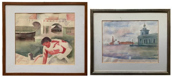 Due acquerelli su carta raffiguranti rispettivamente L'isola di San Giorgio, Venezia e figura in un paesaggio, di misure diverse