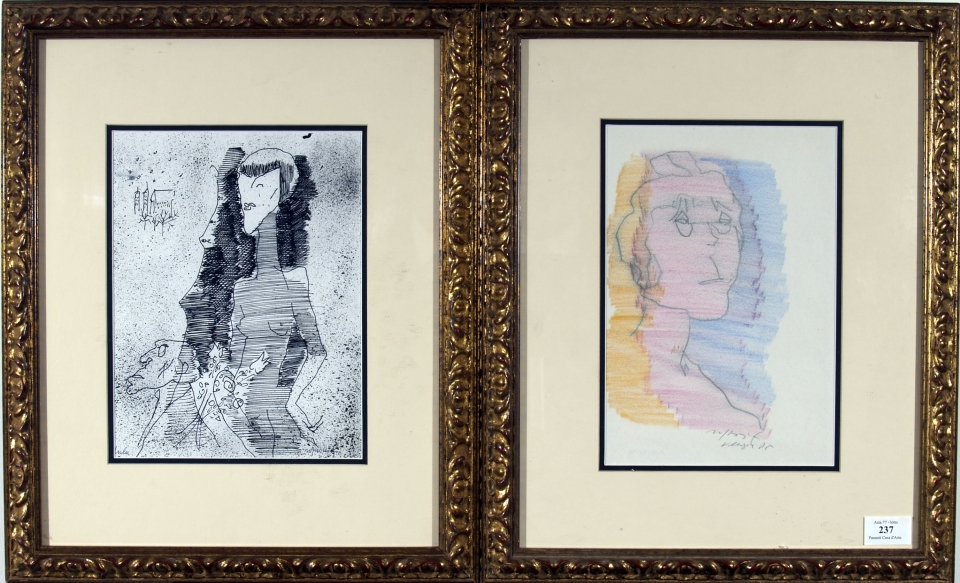 "LOTTO DI 2 OPERE" Acquerello e pastello su carta cm. H: 29.00 L: 22.00 A) "Lulà", acquerello su carta, cm. 28x22. Firma in basso destra. Autentica dell'autore su foto con timbro della Galleria d'Arte Moderna "La Torre" con numero d'archivio 014/A e timbro della Galleria San Carlo (Milano) con numero 12/91/RO123.