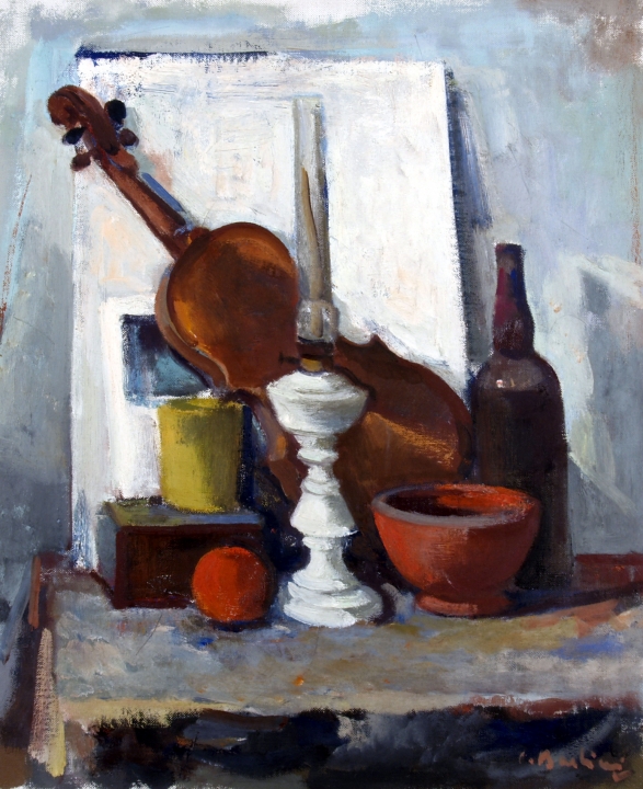 "Natura morta" Olio su tela cm. H: 60.00 L: 50.00 Firma in basso a destra. Verbale di perizia su foto rilasciato dalla Galleria Pace a firma di Gimmi Stefanini, perito d'arte del Tribunale di Milano e della Procura della Repubblica Svizzera, Lugano.