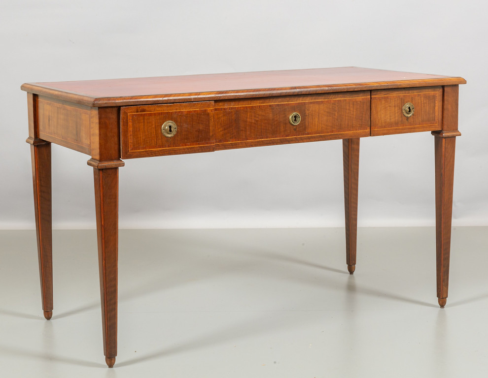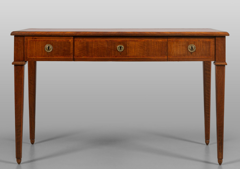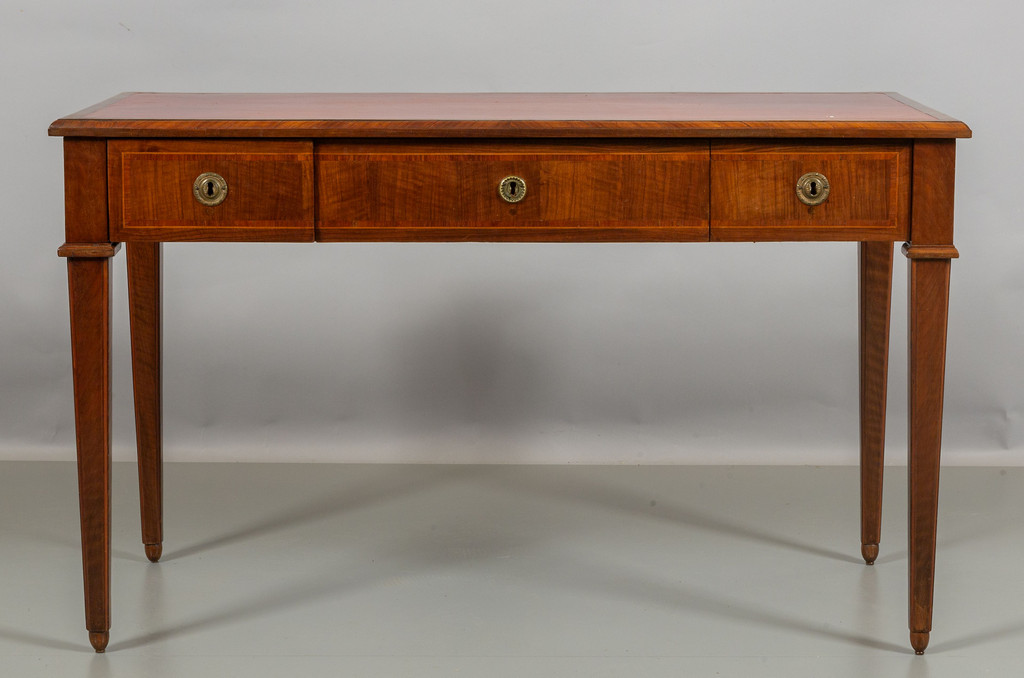 Scrivania Luigi XVI a tre cassetti lastronata in palissandro e filettata in legno di rosa Genova sec.XVIII