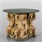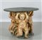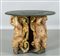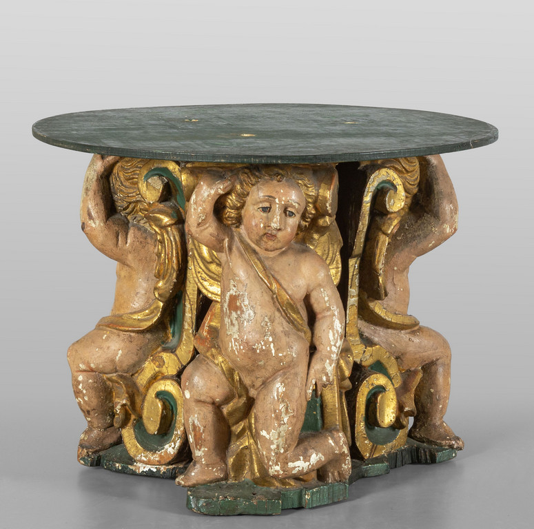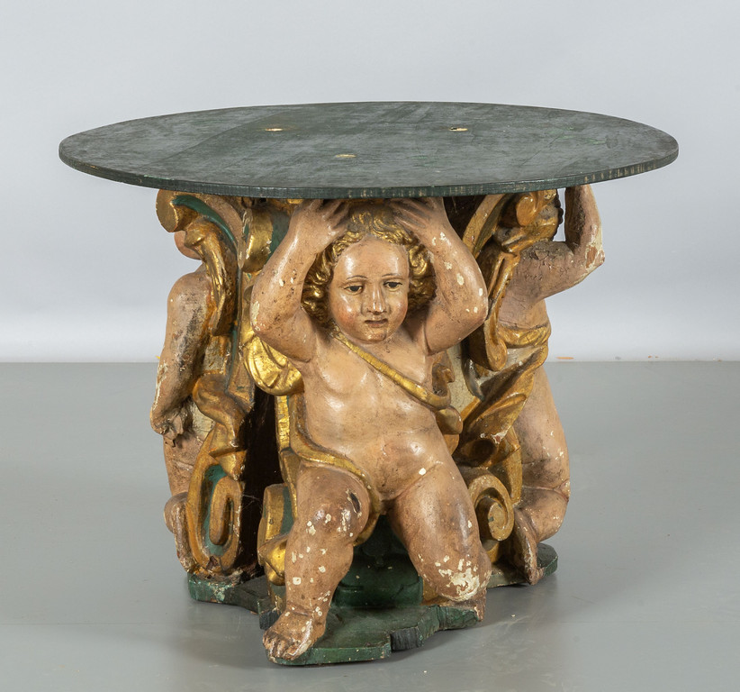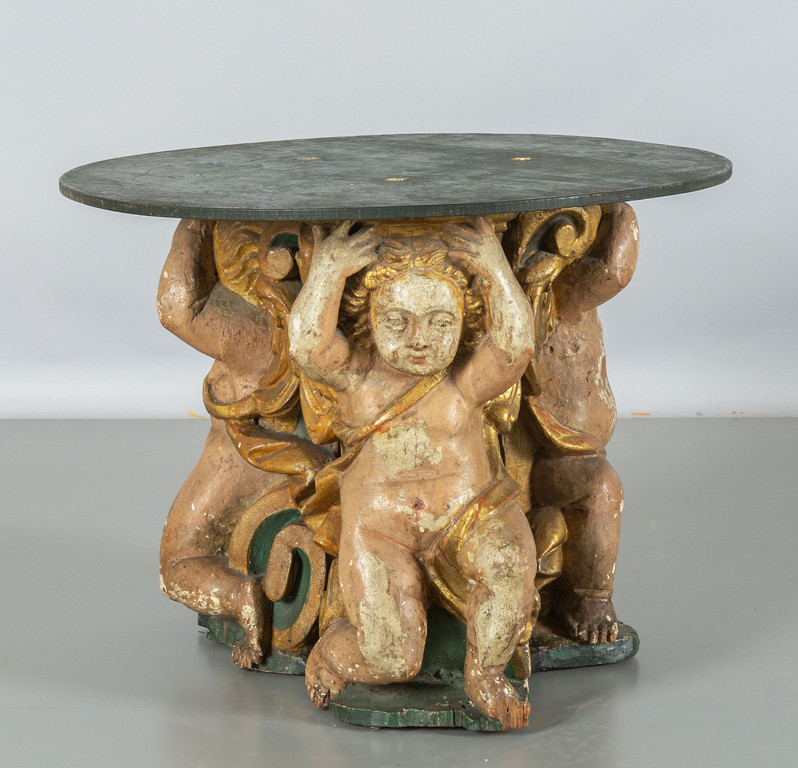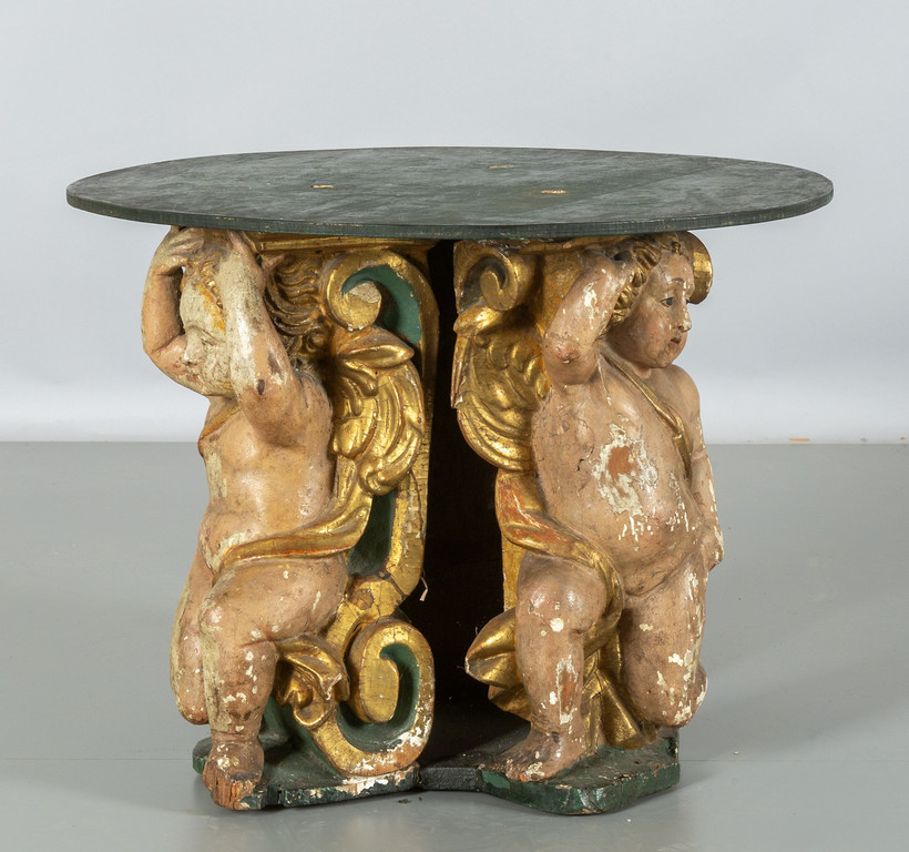 Tre lesene raffiguranti angeli in legno intagliato laccato e dorato montate a tavolino inizi sec.XVII