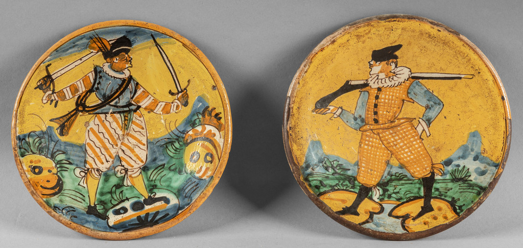 Coppia di piatti in maiolica Montelupo raffiguranti guerrieri sec.XVII
