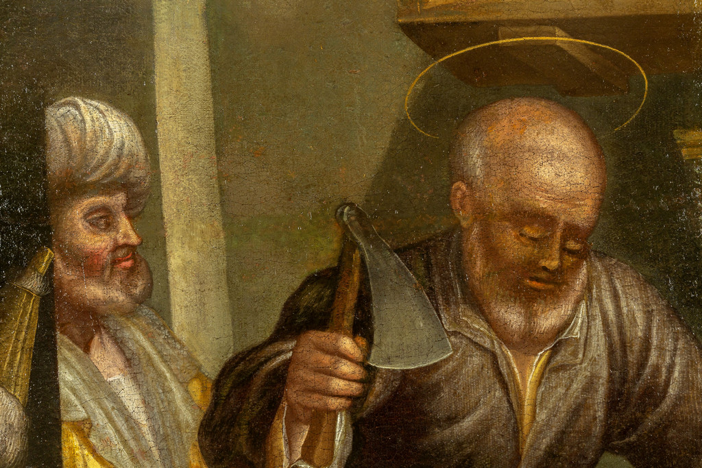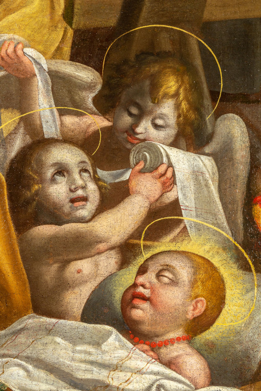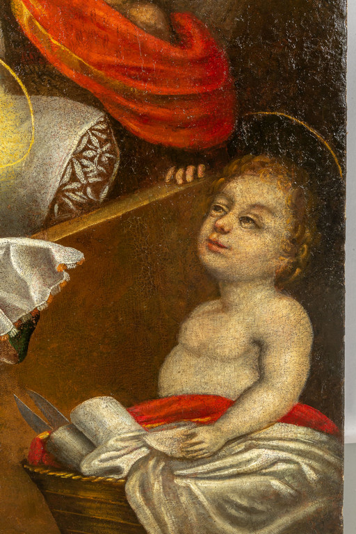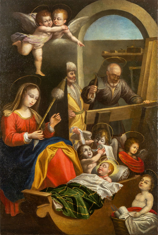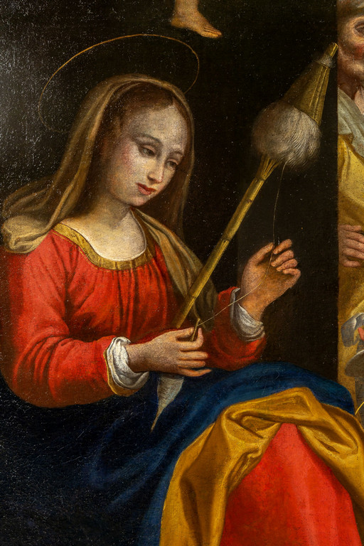 Scuola napoletana sec. XVII 'Sacra Famiglia con la Madonna filatrice e San Giuseppe falegname' olio