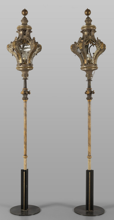 Coppia di lampioni Luigi XIV in lamierino argentato e dorato fusto in legno intagliato laccato e dorato Venezia sec.XVIII