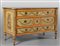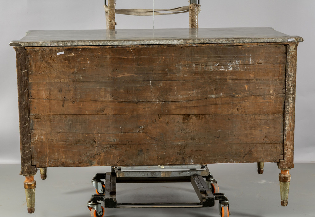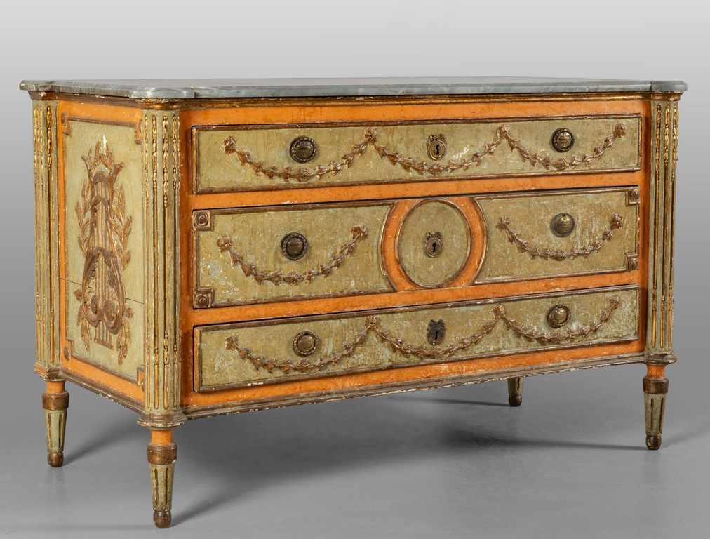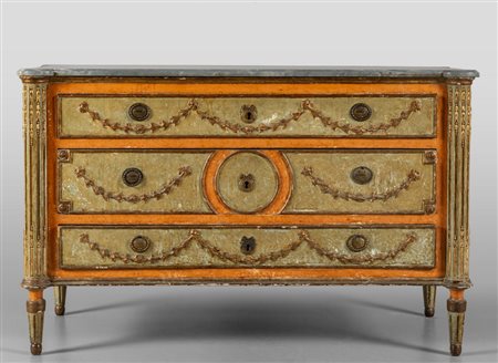 Comò Luigi XVI in legno intagliato laccato e dorato alla maniera del Bonzanigo tre cassetti sul fronte piano in marmo bardiglio Torino fine sec.XVIII